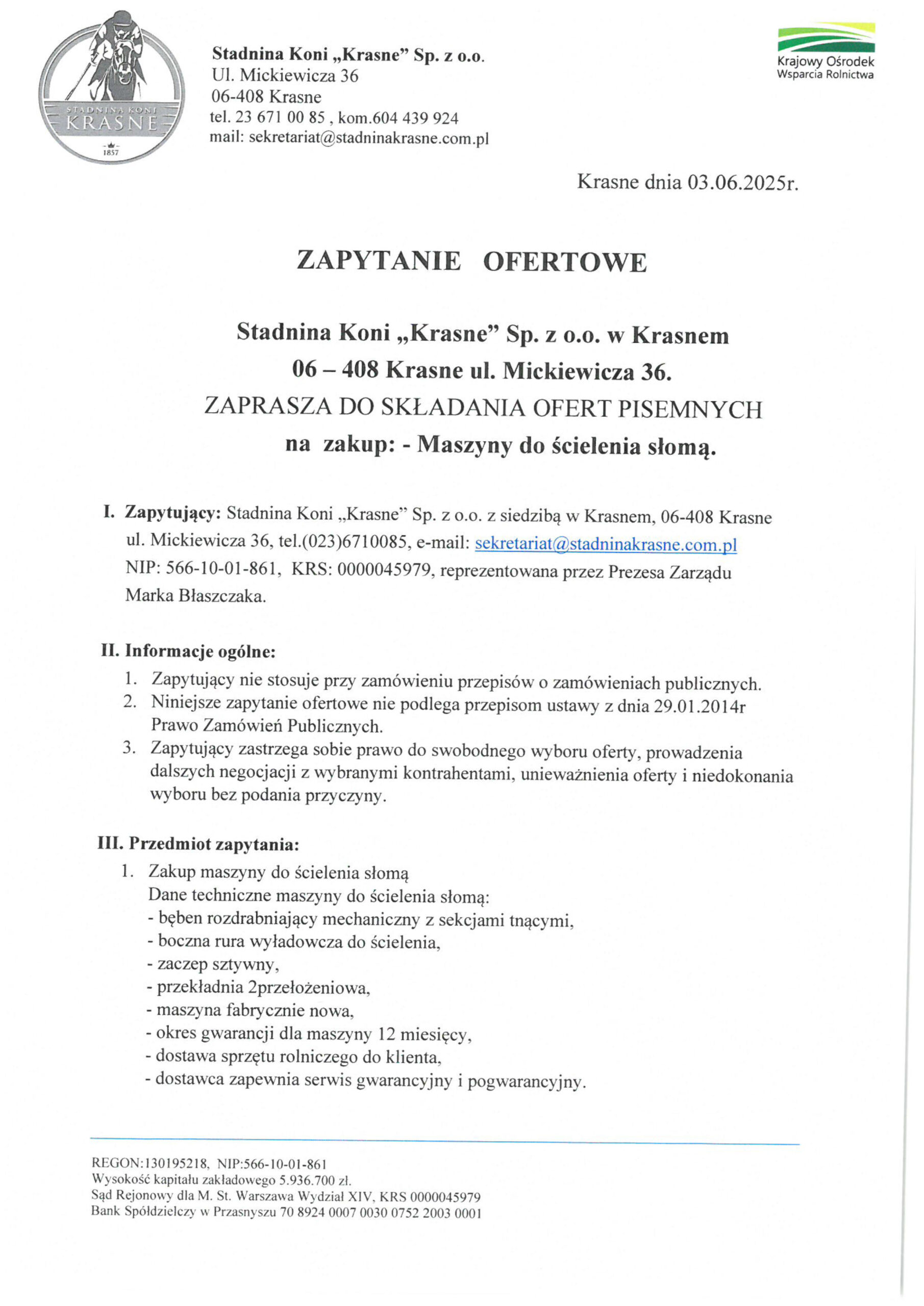 Zapytanie ofertowe na zakup maszyny do ścielenia słomą